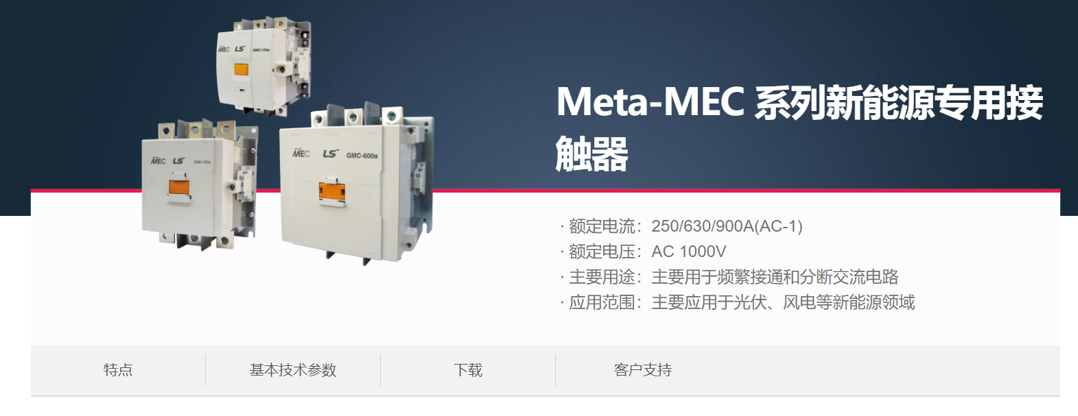 當前位置網站首頁 > 產品展示 > LS產電電氣元器件 > 接觸器(MC)&熱過載繼電器(MS) > Meta-MEC 系列新能源專用接觸器 >